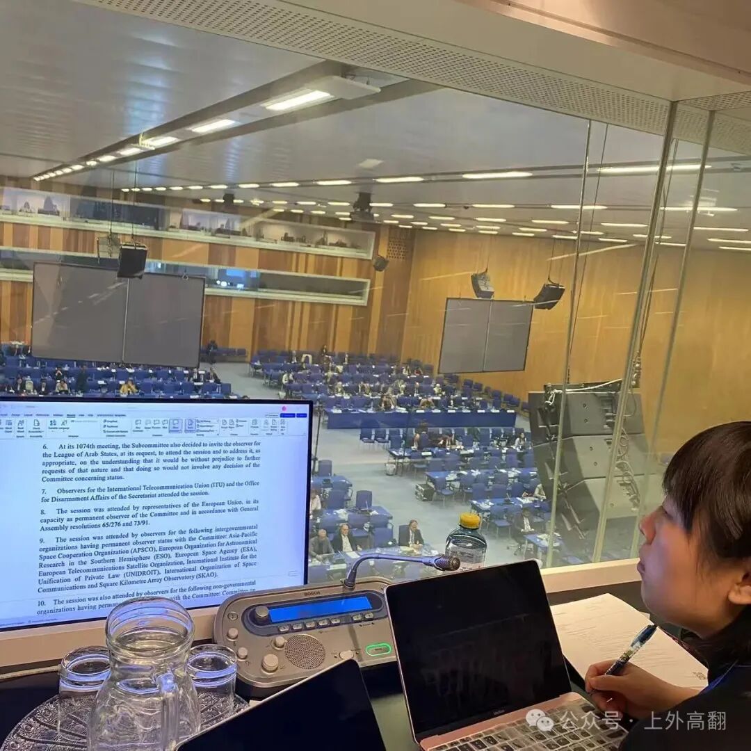 此次实习采用“哑箱”(dummy booth)模式,学生在不开启话筒的情况下,在联合国外层空间事务委员会(Committee on the Peaceful Uses of Outer Space, COPUOS)分委员会会议上进行同声传译训练。联合国维也纳办事处口译处负责人 Marianna Matakova 及中文组负责人张炜、资深译员周育强等为学生提供了系统的安排、资料支持与专业指导。