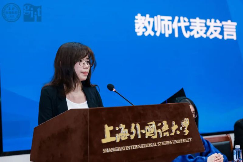 王吟颖老师作为教师代表发言,言辞恳切,饱含期许。回望两年半的时光,王老师希望大家不仅练就跨语言传递信息的专业能力,更拥有连接人心、促进文明互鉴的格局与胸襟。面对人工智能技术发展,她强调翻译的本质是理解人类与社会的复杂性,唯有坚守人文关怀、体察言语真情、坚守价值判断,方能在时代变局中行稳致远。她祝愿全体毕业生保持清醒与热爱,在差异中寻找共识、在分歧中坚守理解、在复杂中发现合作可能,不断前行,成就更好的自己。